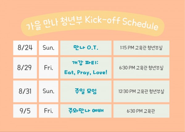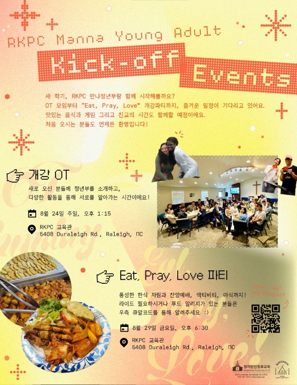 저는 젊은 시절 예수님을 영접한 이후 약 20년간 신앙생활을 해오고 있으며 현재는 랄리한인장로교회(http://www.rkpc.org/)를 출석하고 있습니다. 제가 출석하고 있는 랄리한인장로교회의 청년부에서 돌아오는 주일에 개강 OT와 다음 주 금요일에 개강 파티를 준비하고 있습니다.